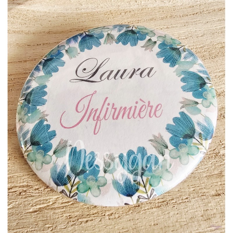 Badge fleurs bleues personnalisé rond infirmière, aide-soignante, sage-femme