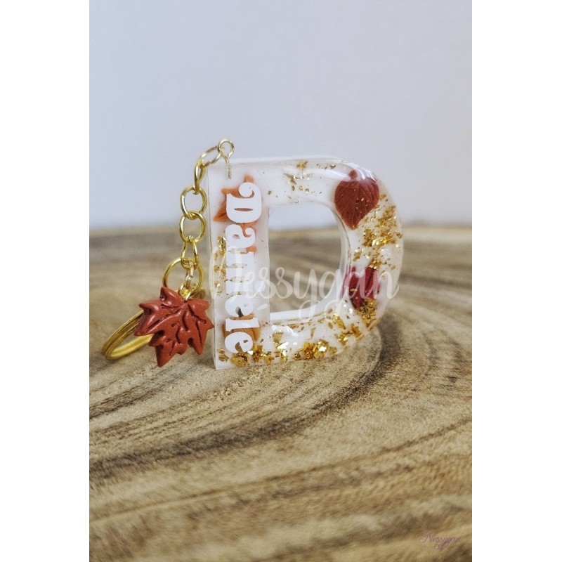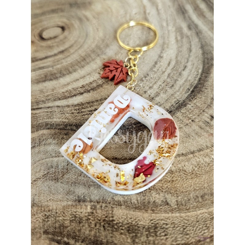 Porte-clé initiale personnalisée automne – Résine, feuille d’or et feuille d’érable