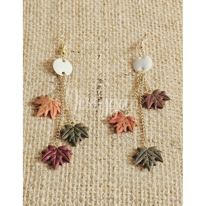 Chaque paire est composée d’un crochet doré, d’un médaillon rond nacré et de trois pendentifs en forme de feuilles d’érable aux teintes automnales (rouge bordeaux, orange terre cuite et vert foncé).