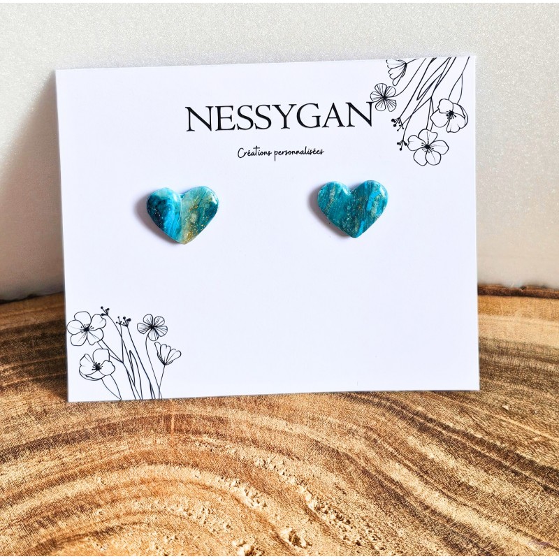 Ces délicates boucles d’oreilles en forme de cœur sont façonnées à la main en pâte polymère marbrée turquoise, puis vernies à la résine pour un fini brillant.