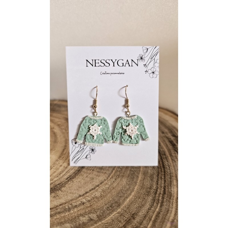 Boucles d’oreilles “Pull Hivernal Menthe” – Création artisanale